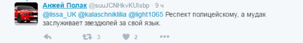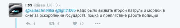 Однак, один з них починає активно перечити та хамити російською мовою. У відповідь поліцейський просить його спілкуватися українською.