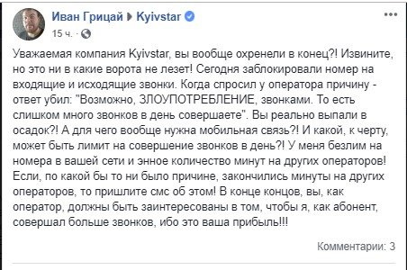 "Ви взагалі охр*ніли в кінець?! Вибачте, але це ні в які ворота не лізе! Сьогодні заблокували номер на вхідні та вихідні дзвінки. Коли запитав у оператора причину - відповідь вбила: "Можливо, зловживання, дзвінками. Тобто дуже багато дзвінків в день робите". Ви реально випали в осад?! А для чого взагалі потрібен мобільний зв'язок?! І який, до біса, може бути ліміт на здійснення дзвінків в день?! У мене безлім на номери у вашій мережі і енну кількість хвилин на інших операторів! Якщо, з якоїсь причини, закінчилися хвилини на інших операторів, то надішліть смс про це! В кінці кінців, ви, як оператор, повинні бути зацікавлені в тому, щоб я, як абонент, здійснював більше дзвінків, бо це ваша прибуток" - написав Іван.