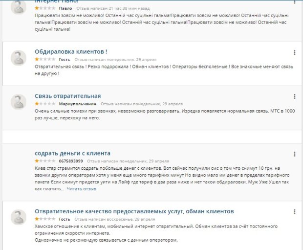 "Просто скоти, більше нічого сказати, все вже сказано абонентами Коли вже нажретесь? ", "Київстар перетворився на шахраїв, ніколи б не подумала, що улюблений оператор буде так підло обкрадати своїх абонентів.", "Огидний зв'язок ! Різко подорожчала ! Обман клієнтів ! Оператори даремні! Всі знайомі змінюють зв'язок на інший!", "Хамське ставлення до клієнтів, мобільний інтернет огидний. Обман клієнтів за рахунок постійного обмеження швидкості інтернету." - останні коментарі про Kyivstar.